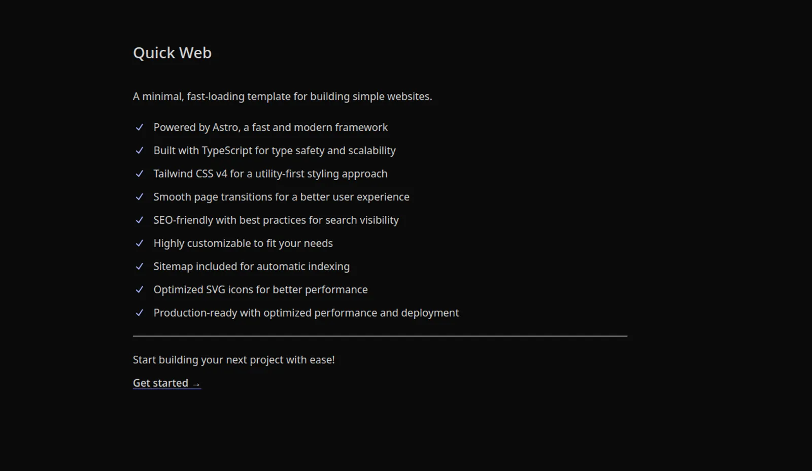 This template comes preconfigured with commonly used tools in web development. With minimal styling, SEO support, sitemap integration, and ViewTransition, it also includes automated workflows for linting, formatting, and Git hooks, along with testing setups using Vitest and end-to-end testing with Playwright, making it a solid and efficient starting point.